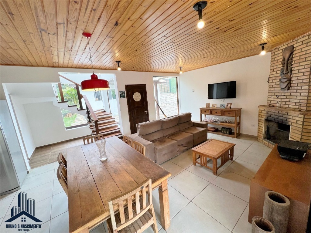 Já na entrada, sala de estar, jantar, lareira, lavabo, cozinha completa americana com bancada, despensa, e lavanderia coberta.